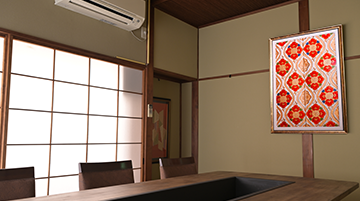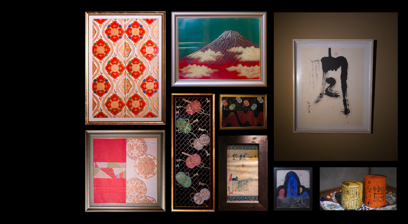 기모노의 클래식한 오비를 액자화해 각 코너에 장식했습니다. 고(故) 극락보 씨의 묵화 ‘달’과 카야마 씨의 ‘적후지’도 꼭 감상해 보세요.